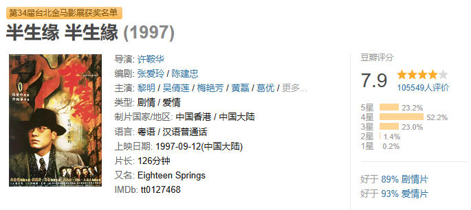 豆瓣网站对《半生缘》也有相当不错的7.9分评价。可是这些带有一定鼓励性质的肯定并不能掩盖影片存在的巨大缺陷,而这些缺陷既是小说天然的改编难点造成的,也是创作者对小说、对张爱玲美学的认识偏差、认识盲点以及自身力有不逮所致。