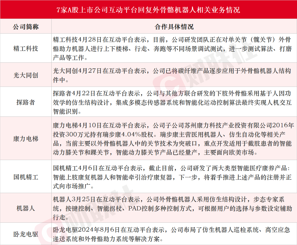 方正证券郭彦辰在4月25日的研报中表示,建议关注振江股份,其子公司海普曼机器人专注于外骨骼机器人的智能控制算法及仿生学设计的研究,致力于降低成本并推动外骨骼机器人的普及。除振江股份外,近期在互动平台回复布局外骨骼机器人相关业务的A股上市公司有精工科技、光大同创、探路者、康力电梯、国机精工、机器人和卧龙电驱,详细情况见下图: