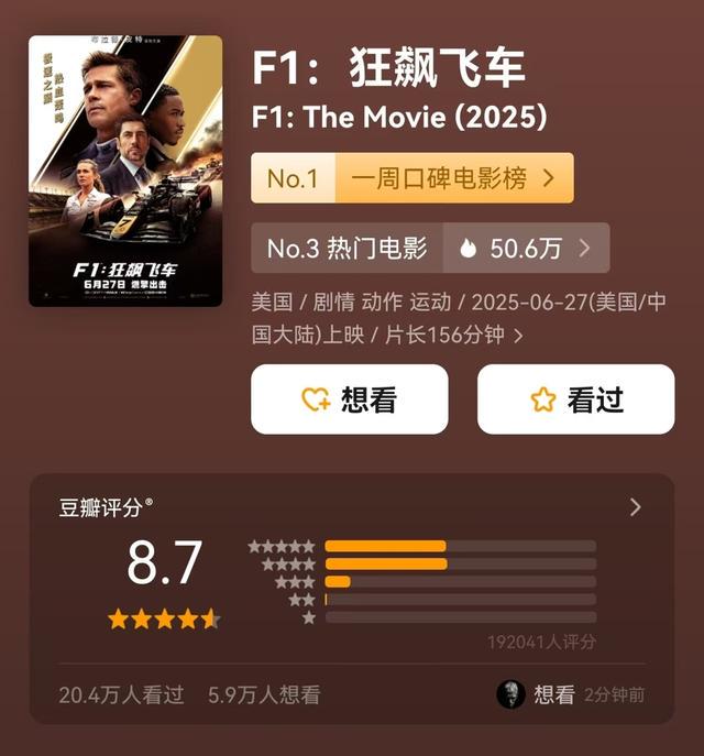 与之相关的一组数据是,2025年上半年特效厅票房同比增长近6成,IMAX中国上半年票房同比翻倍。今年暑期档中,IMAX中国票房总计5.31亿元,同比去年暑期档增长31%。《F1:狂飙飞车》被称作“为IMAX而生”的电影,中国市场票房已破4亿元,其中IMAX票房占比高达42%。“《F1:狂飙飞车》的沉浸式体验感很强,尤其在IMAX影院,尽管票价不便宜,但看完觉得值。”导演米子说。影评人周瑜将其列为今年暑期档最喜欢的影片之一,简明的叙事语言,好特效和速度感都是让她觉得超出预期的部分。“主演布拉德·皮特已经61岁了,但表演非常到位。”